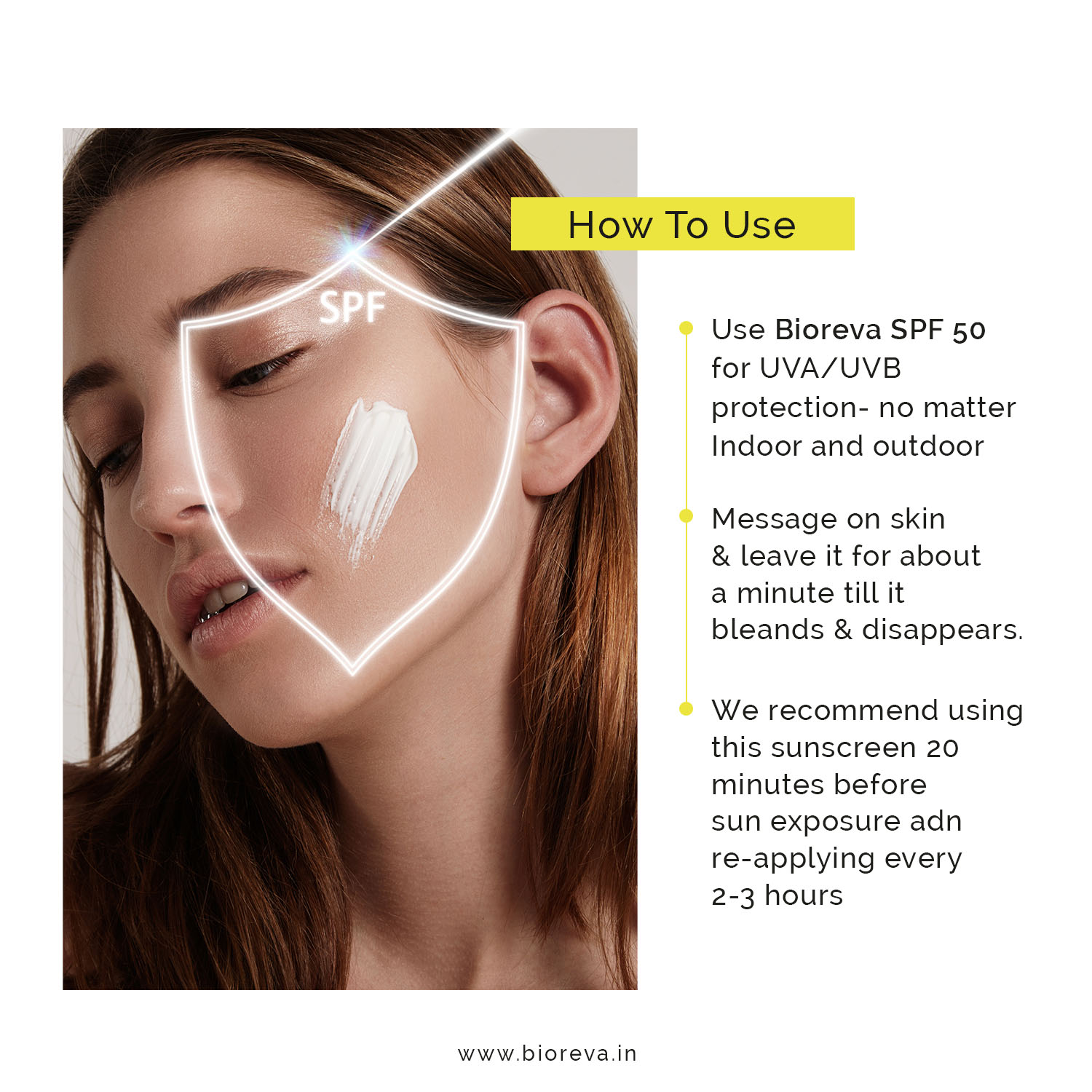 Bioreva SPF 50 prevents the entry of UVA & UVB rays, pollutants and chemicals in to the skin and offer breathable protection. Bioreva SPF 50 protect skin and replenishes skin barrier functions :